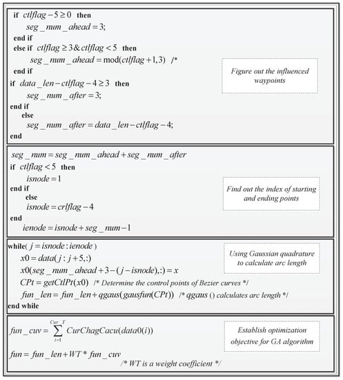 where represents the related path length and denotes a user-defined continuity threshold. Numerical methods such as steepest descent and Newton’s method are usually employed to solve such optimization problems, but in practice, the integral for calculating the arc length cannot be solved. By contrast, the Gaussian quadrature method only needs the polynomial form of the integral and selects the expected number of points on the integral interval, reducing the computational complexity dramatically. To increase the computational efficiency, both the Gaussian quadrature method and a Genetic Algorithm (GA) are adopted. The input and output of the algorithm are the set of waypoints and the coordinates of the objective point, respectively.The main steps of the optimal interpolation are described in Figure 4.