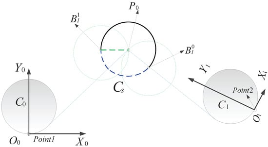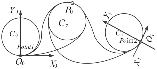 To determine the optimal center position of the auxiliary circle, the boundary conditions should first be established. Results in Section 5.2 show that the points of tangency on the inner tangent lines between two minimum circles are upper bounds on the end points for s-shape transition curves. The lower bounds can be determined by setting m to one. As an illustrative example, consider three pairs of points and their minimum curvature circles, as shown in Figure 7. Here, Point 1 and Point 2 are the predetermined start and end points, and is a predefined waypoint. The tangent directions at the start and end points are both counter-clockwise. Additionally, the fixed point is required to be on the sub-path. For simplicity’s sake, the circle that passes through is defined as an auxiliary circle as follows.