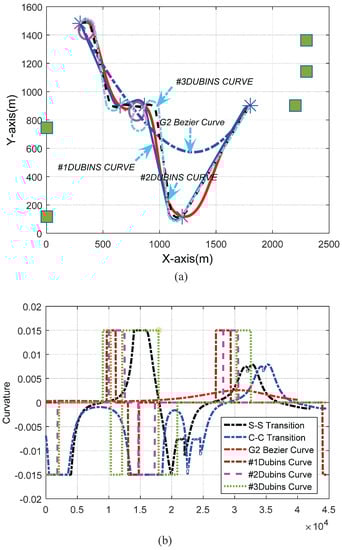 To deal with the curvature discontinuity problem, two categories of curves are utilized in [21,22,23,24,25,26]. The first category involves parameterizing the curvature by arc length using, for example, clothoids [21,22]. Clothoid pairs can provide the shortest curves for a given turn angle [27]. However, there is no closed-form expression for position along the path or its approximation. Moreover, look-up tables are usually required, increasing the operational complexity. The second category can provide closed-form solutions, using, for example, B-splines, Bezier curves or spatial Pythagorean hodographs [23,24,25,27,28,29,30]. These curves are used for trajectory generation for both UAVs [23,24] and autonomous robots [25,28]. However, path curvature is a high-order function of curve parameters, and it is a formidable challenge to analyze its monotonicity. Generated paths have continuous curvature when using Bezier curves [31] or B-splines [32], but little attention has been given to the maximum curvature constraint. Although it has been demonstrated that curvature extrema can be obtained numerically for any planar cubic curve, this might be a challenge for parametric polynomial curves [29,33], since it is difficult to solve the formulated curvature extremum model. An objective function has been designed to search for proper Bezier curve parameters that satisfy the maximum curvature constraint, but the optimization problem remains unsolved [34]. Additionally, combined Bezier curves can be used to generate continuous curvature paths with bounded curvature extrema in both 2D and 3D space [24]. Shanmugavel et al. [30] have proposed a Pythagorean hodograph curve for 3D path planning, achieving bounded curvature and equal path lengths. Unfortunately, the generated path only passes through some of the waypoints, accordingly leading to failure of some specified tasks.
