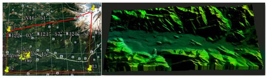Further, we have also tested our methodology using fixed-wing UAV models in STK, which is a physics-based software package from Analytical Graphics, Inc (220 Valley Creek Blvd. Exton, PA USA). The turn acceleration (an inherent parameter of the UAV) is 29.42 m/s2, and the cruise velocity is fixed as 160 km/h. To simulate the real flying conditions, we chose an area from Google Earth, and for the verification of the algorithm, the elevation map of the same region obtained from GlobalMapper was used. The experiments were carried out by using a topology map as shown in Figure 12, the longitude of which ranges from 50’5.99” W–5’52.79” W, and the latitude ranges from 42’3.6” N–48’32.4” N.