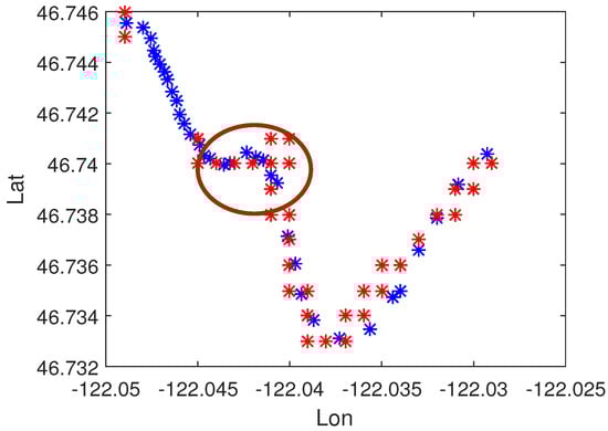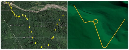 In order to observe the effect of the generated path, the path was discretized into points that were embedded into the UAV control system. Figure 13 shows the path generated by the proposed algorithm and the realistic trajectory. The result comparisons are demonstrated in Figure 14. The blue markers represent the path generated by our method, while the red ones denote the realistic trajectory. From the comparisons, we can see that the motion trajectory of the UAV coincides with the trajectory of planning. A remarkable detail was shown circled in maroon. It can be seen that the pre-designed path had the shape of a bump, but the UAV actually flies along a circle. This is because an s-s-shaped transition was used in our method, while the UAV followed a c-c-shaped transition. In addition, we can also see the phenomenon of path deviation in some piecewise paths. However, these path biases were mainly caused by two reasons: resolution restriction on Google Earth and GPS positioning error. Google Earth provided DEM of an area with 0.5–1-m resolution, while the positioning error of commercial GPS can be 5–20 m. This consequently resulted in path errors under those allowed.