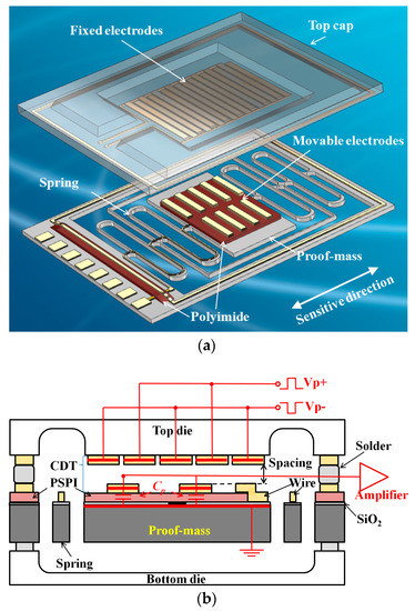 Schematic of the micro accelerometer using an encoder-like area-changed transducer. (a) Structure of the capacitive accelerometer. The spring-mass system is also used as a micro position actuator for the calibration of the capacitive transducer; (b) Section view of the capacitive accelerometer, the electrodes on the top die and the proof-mass die form the capacitive displacement transducer (CDT); a photosensitive polyimide (PSPI) is inserted for reducing the parasitic capacitance.