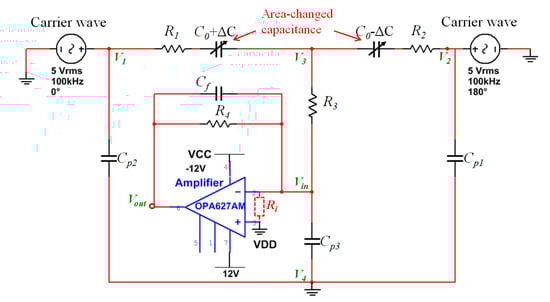 The parasitic capacitance was firstly analyzed. The model of the encoder-like area-changed capacitive transducer including parasitic capacitance and the front-end operational amplifier was built based on actual parameters, as shown in Figure 2.