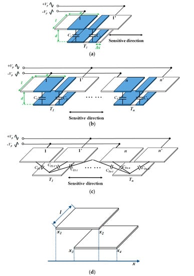According to Equation (11), n should be as large as possible to increase the sensitivity. However, a larger n requires a smaller dimension of electrodes in the sensitive direction (a), which will violate the dimension conditions of the ideal plane-parallel capacitor model. Therefore, the fringe effect must be considered. As shown in Figure 3c, the capacitances between any two electrodes should be included, not simply the capacitance of the facing areas.