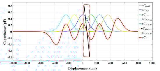 We analyzed the fringe effect of the electrode Ti using our model as an example. Assume that the original position of electrode Ti is facing the electrode i on the top die completely. When the displacement varies from 20 to 100 μm, the variations of , , ,, , were calculated using Equation (13), as shown in Figure 4.