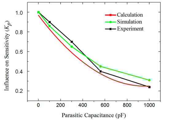 The theoretical, simulated and experimental results of the decrease in sensitivity caused by the parasitic capacitance are shown in Figure 7. The sensitivity of the transducer is negatively correlated with the parasitic capacitance. The simulation and experiment corresponded well with the calculations based on Equation (6).