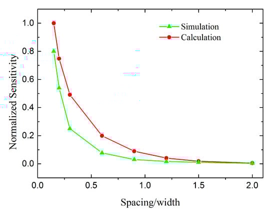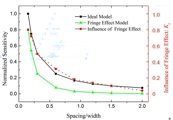 The decreased insensitivity caused by the fringe effect is shown in Figure 9. The curves reveal that the fringe capacitance induces a decrease in the sensitivity. The decrement becomes particularly significant when the capacitor spacing becomes larger than the width of a single electrode.