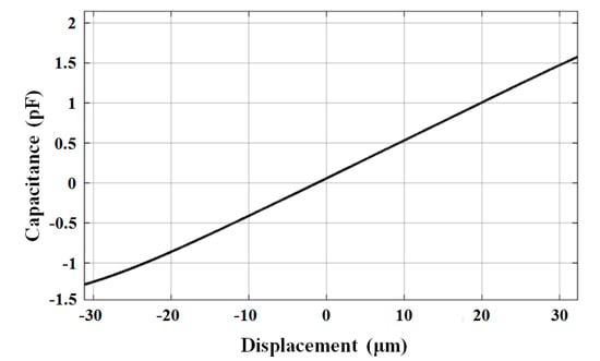 The calibration curve of the optimized capacitive transducer is shown in Figure 10. The sensitivity was measured as 46 pF/mm. Using the capacitive readout circuit with a noise floor of 2 × 10−6 pF/√Hz at 0.1 Hz, a displacement measurement resolution of 50 pm/√Hz was achieved at 0.1 Hz. The displacement resolution can be further optimized by using a better readout circuit. The linearity error of the transducer within ±10 μm was 0.04% of the measurable range. The offset was from the original displacement caused by installation error and packaging error.
