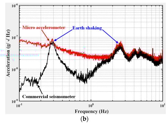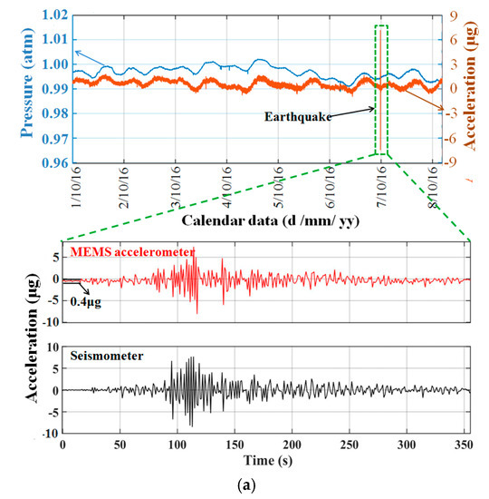 The optimized capacitive transducer was applied to the micro accelerometer. A static measurement was performed in our cave laboratory under a quiet environment for earthquake monitoring from 1 October 2016 to 8 October 2016 (UTC-8). A commercial seismometer (CMG-3EPS, Guralp) was installed adjacent to the micro accelerometer as a reference. The output data of the accelerometer is shown in Figure 11a. The unusual vibration was proven to be the Ms5.9 earthquake that occurred in Taiwan at 23:51 6 October 2016 (UTC-8). The vibration was also detected by the commercial seismometer with a similar amplifier and profile. The continuous output of the accelerometer shows a strong correlation with the variation of air pressure. This correlation with air pressure is probably because when the air pressure of the outside environment changed, a deformation of the top die occurred as the pressure inside the sensors remained the same as the hermetic sealing, then the spacing of the capacitive transducer changed causing the change in the capacitance. It also implies the possibility of improving the long-term stability by alleviating the pressure interference. The experimentally measured noise-limited resolution of the optimized accelerometer is shown in Figure 11b. The resolution was approximately 30 ng /√Hz at 1 Hz. The peak caused by the earth shaking was also detected by the commercial high-resolution seismometer (Guralp, 3ESPC), which indicates that the noise floor of the MEMS was better than the background noise in our laboratory at frequencies of approximately 0.3 Hz and 2.5 Hz.
