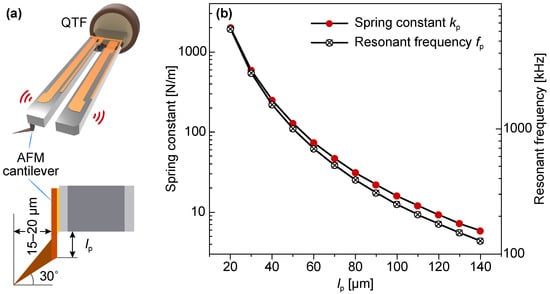 (a) configuration of the QTF force sensor; (b) variations in the spring constant and resonance frequency of the suspended cantilever as functions of the length () of the suspended cantilever ().