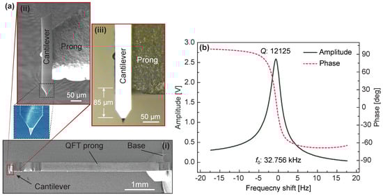 Figure 3a shows scanning electron microscope (SEM) ((i) and (ii)) and optical microscopy ((iii)) images of the assembled QTF force sensor, where the length of the suspended cantilever is 85 m. The Q-factor and resonance frequency of the sensors are measured with Nanonis electronics (SPECS Zurich GmbH, Zurich, Switzerland). As shown in Figure 3b, due to the lightweight of the attached cantilever, the sensor’s Q-factor is as high as 12,125, a reduction of only 7.4% as compared to the bare QTF (Q-factor: 13,097), which is a significant improvement over the previous results and allows high-sensitivity force detection without any techniques of mass balancing or Q-control [25,26].