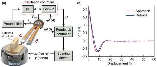 (a) schematic of the sidewall scanning method with the QTF force sensor. An XYZ scanner is used for image scan by moving sample. The QTF sensor is excited with a sinusoidal signal from an oscillation controller and current from the sensing electrode is collected by a transimpedance preamplifier. Two feedback loops are used to drive the sensor at a constant amplitude and regulate tip-sample distance; (b) frequency shift () of the QTF sensor as a function of tip-sample displacement measured on a silicon sidewall.