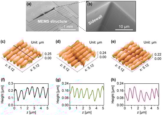 Figure 6c–e show examples of the AFM topographies of the sidewalls scan of the MEMS structure with 256 lines of 256 points (scan area: 5.12 m × 5.12 m, step length: 20 nm). Figure 6f–h show height profiles of the sidewalls scanned through the lines indicated in Figure 6c–e, respectively. All images and respective profiles show that the sidewalls of the MEMS structure have waviness along the length of the features (x-axis) that are generated during the deep reactive ion etching (DIRE) process.