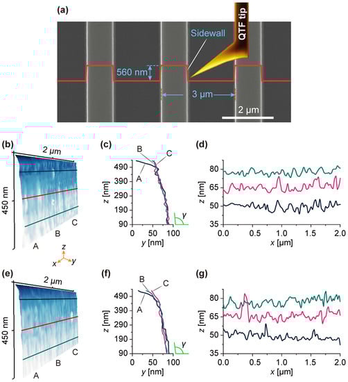To demonstrate the capability of sidewall imaging of nanostructure, sidewalls of a step grating TGZ3 (NT-MDT, Moscow, Russia) were scanned. The grating has a top width, step height and pitch of about 1 m, nm and m, respectively (provided by the manufacturer). The grating was aligned with the sidewalls parallel to the x-axis (fast scan direction). As illustrated in Figure 7a, the QTF sensor can reach the bottom of the narrow trench (∼2 m width) and scan the footing of the sidewall due to the tilted protruding tip. Once the grating top surface was detected, the sidewall scan begun near the top edge. Ninety lines of 200 points were recorded on each scan area ( m) of the sidewalls. Figure 7b,e show the reconstructed AFM topography images of the TGZ3 sidewall. Figure 7c,f illustrate line profiles along the slow scan direction (z-axis) through the points A, B, and C indicated in Figure 7b,e, respectively. Close to the top part, profile A is obviously different from other two profiles, which indicates that the grating is tilted because of the sum of the mounting error and out-of-plane motion of the scanner on the x-axis. These line profiles are used to calculate the sidewall angle . Averaged from 200 measurements on slow scan lines, the sidewall angles summarized in Table 2 (the segments are defined along the x-axis) with consideration of the mounting angle error of the grating. Figure 7d,g are line profiles along the lines indicated in Figure 7b,e, respectively. The height profiles along the x-axis were extracted at equal intervals (along the z-axis) for statistical analysis of the LER. The LER measurement results on these lines are summarized in Table 3.
