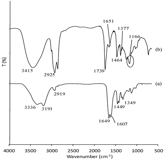 Fourier-Transform Infrared Red (FTIR) spectra of (a) poly(AAM) and (b) poly(AAM-co-EMA). Reproduced from [AIP Conference Proceedings 1784, 030017 (2016); doi:10.1063/1.4966755] with permission of AIP Publishing [32].