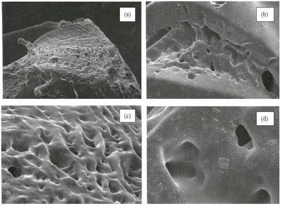 Micrographs of (a) poly(AAm) and (b) poly(AAm-co-EMA) at 100× of magnification, (c) Poly(AAm) and (d) poly(AAm-co-EMA) at 500× of magnification. Reproduced from [AIP Conference Proceedings 1784, 030017 (2016); doi:10.1063/1.4966755] with permission of AIP Publishing [32].