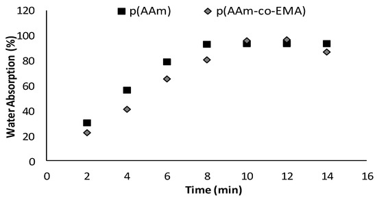 Water absorption percentage as a function of time for the membrane poly(AAm) and poly(AAm-co-EMA). Reproduced from [AIP Conference Proceedings 1784, 030017 (2016); doi:10.1063/1.4966755] with permission of AIP Publishing [32].