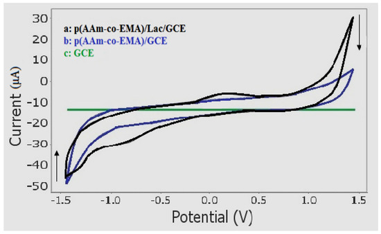 The electrochemical behavior of the Sunset Yellow biosensor was analyzed using 30 µM Sunset Yellow in 0.05 M PBS (pH 5) using a bare GC electrode (GCE), a poly(AAm-co-EMA) coated electrode, and an electrode modified with laccase (producing a poly(AAm-co-EMA)/Lac/GCE). The analyses were performed using CV with a potential window from −1.500 to 1.500 V. In the presence of Sunset Yellow, neither oxidation nor reduction peaks were observed from either the bare GCE or poly(AAm-co-EMA/GCE) (Figure 4). However, after laccase was introduced via a poly(AAm-co-EMA)/Lac membrane, a pair of well-defined and partially reversible redox peaks were observed in the cyclic voltammograms (Ipa = 2.132 µA, Epa = 0.296 V; Ipc = −3.766 µM, Epc = −0.806 V). These peaks indicated that the modified electrode significantly improved the redox reaction of Sunset Yellow, and therefore is suitable for use in a biosensor. As reported previously, anodic peak potentials of 0.6–0.95 V were recorded for Sunset Yellow [2,8,17]. However, the oxidation potential of the Sunset Yellow biosensor developed in the present study was lower than previously reported chemical sensors. Yang and Li [21] also reported a lower oxidation potential at 0.020 V (SCE references electrode). A biosensor with a low oxidation potential is favourable, because it can avoid oxidation of potential interferents that may coexist with Sunset Yellow in real samples. Sunset Yellow contains an –OH group attached to the benzene ring structure that accommodates an electron and facilitates proton transfer. This suggests that the redox reaction of Sunset Yellow occurred at the –OH group, with a potential of 0.296 V for oxidation and −0.806 V for reduction.