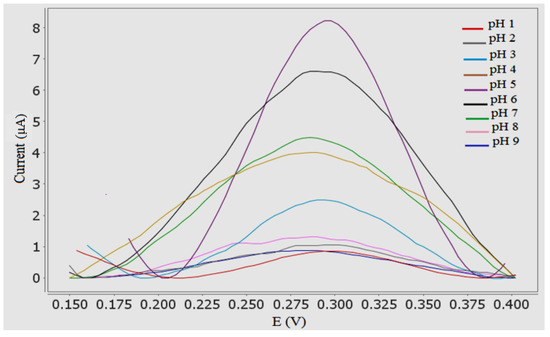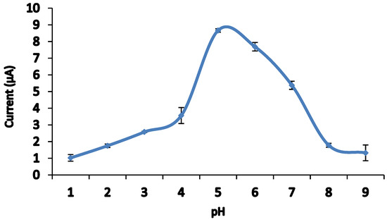The electrochemical behavior of Sunset Yellow in 0.05 M PBS was studied across a range of pH values. The effect of pH on the response of the Sunset Yellow biosensor poly(AAm-co-EMA)/Lac/GCE was measured using DPV. Based on Figure 5 and Figure 6, the oxidation peak current increased from pH 1 to 4, and increased dramatically at pH 5. The current slowly decreased from pH 6 to 9. This decline was attributed to the loss of enzyme catalytic activity [23]. The Sunset Yellow signal was highest in pH 5 buffer; this condition was chosen for further studies. Similar results were reported by Li et al. [24], who entrapped laccase in silica spheres to detect dopamine in pH 5 PBS. In addition, these results correspond to the optimum pH range (3.5–5.0) of free laccase. Thus, the enzyme immobilization procedure was unlikely to affect the enzyme activity [36,37].