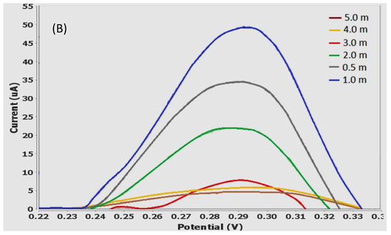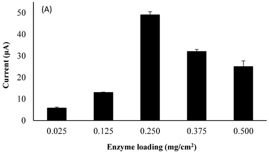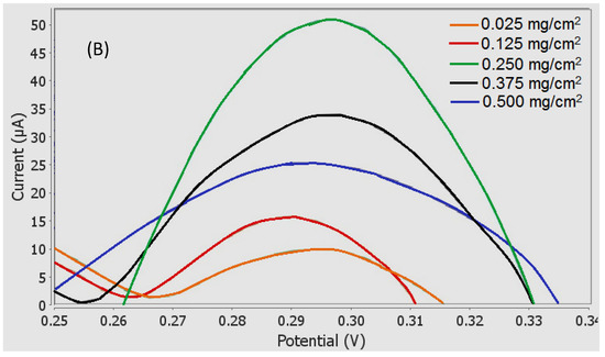 To characterize the influence of laccase loading (0.025–0.500 mg/cm2) on the detection of Sunset Yellow, the electrochemical behavior of 10.00 µM Sunset Yellow in 0.05 M PBS was examined using poly(AAm-co-EMA)/Lac/GCE as a working electrode. It has been reported that the loading of immobilized enzyme on an electrode surface significantly affects biosensor sensitivity, detection limit, linear range, and substrate conversion [23]. As expected, the oxidation peak current of Sunset Yellow was strongly dependent on the enzyme loading (Figure 7A,B). Generally, the oxidation peak current increased with increasing enzyme loading. The maximum oxidation peak current was observed when the enzyme loading was 0.250 mg/cm2. However, increasing the enzyme loading from 0.250 to 0.500 mg/cm2 resulted in a significant decrease in the oxidation peak current of Sunset Yellow. This may be due to the photopolymerization technique, which results in a high-density crosslinked polymer with low interstitial space. Hence, the active site of the enzyme is also insulated, and not fully available to catalyze the redox reaction at high enzyme loadings, thereby decreasing laccase activity [28].