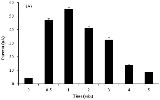 Figure 8 shows the effects of accumulation time (0–5 min) on the oxidation peak current of 10 µM Sunset Yellow in 0.05 M PBS (pH 5) using a poly(AAm-co-EMA)/Lac/GCE. The signal increased dramatically from 0.5 to 1 min of accumulation time. Hence, accumulation time significantly affects biosensor sensitivity [21]. However, the oxidation peak current decreased when the accumulation time was increased from 1 to 5 min. This corresponds to previous findings, that the biosensor sensitivity may be limited by the saturation of Sunset Yellow on the electrode [5,7]. Therefore, an accumulation time of 1 min was chosen for use in further experiments.