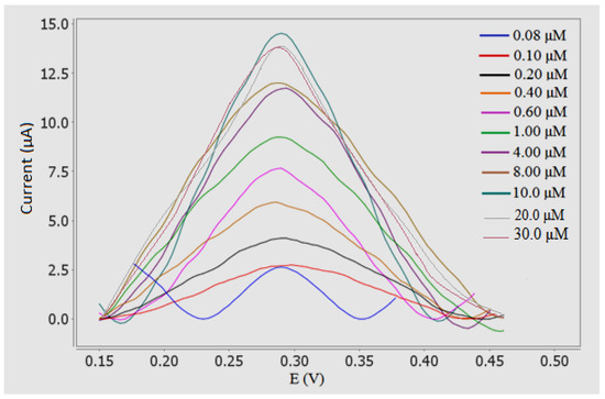 DPV of Sunset Yellow biosensor (polymer with different concentration of Sunset Yellow (in range from 0.08 to 30.0 µM) in 0.05 M PBS (pH 5) and accumulation time: 1 min (optimum condition) S/N = 3.