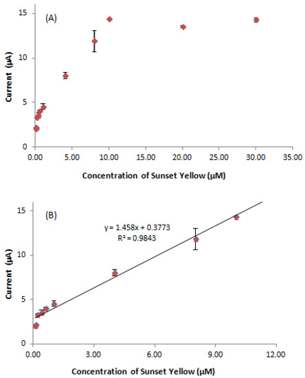 Under the optimum condition, DPV was performed to investigate the relationship between the peak currents and different concentration of Sunset Yellow. The oxidation peak current increased with increasing Sunset Yellow concentration (Figure 9). In addition, the linear concentration range of Sunset Yellow was 0.08 to 10.00 µM (regression equation: y = 1.458x + 0.3773, R2 = 0.9843) (Figure 10B). At higher concentrations, the response was no longer linear because of the diffusion limit [38]. Yin et al. 2017 [39] also has stated that calibration curve gradually deviated from the straight line, indicating that saturated of adsorption was gradually reached. The detection limit (LOD) of Sunset Yellow was determined to be 0.02 μM. These results indicated a very good analytical performance of the developed electrochemical biosensor in food and beverages products analysis.