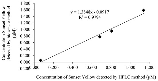 A comparison between the Sunset Yellow biosensor and HPLC method for the determination of Sunset Yellow.