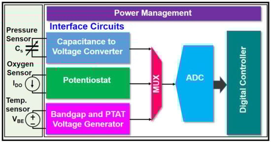 Recently, advanced microfabrication, including complementary metal-oxide-semiconductor (CMOS) and micro-electromechanical systems (MEMS) technologies, have been enabling the fast development of various modern biomedical sensors of higher accuracy, good reliability, and excellent sensitivity with lower cost, low power consumption, and small form factor [1,2]. Also, recent progress in wireless communication technology and ultra-low power integrated circuit technology have made it possible to build miniaturized and reliable biomedical sensor systems for emerging biomedical applications, including e-healthcare and u-healthcare [3,4,5,6,7,8,9]. In the past decade, various biomedical sensors and systems have been developed for portable, wearable, and implantable monitoring applications. Especially, multiple biomedical sensor monitoring is essential for many clinical applications that require reliable and biocompatible physiological monitoring [10,11,12,13]. Intracorporeal physiological condition monitoring such as pressure, oxygen, and temperature monitoring is widely used during the illness precaution and treatment [11,12,13]. Examples that require such multi-parameter monitoring are intracranial monitoring [14,15,16] and intra-abdominal condition monitoring [17,18].