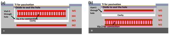 In the Design 1 (Figure 3a), the M2 works as the bottom plate of the capacitive pressure sensor, while the M4/5 (connected through via hole) is the top plate. M3 was etched away through the connected via 3-5. The via hole was subsequently filled by SiO2 and Ti for vacuum sealing. Similarly, in the Design 2 (Figure 3b), the pressure-sensitive membrane is IMD4/M5/IMD5 and passivation layer, whereas M2/3 and M5 are the bottom and top plates of the capacitive pressure sensor. Table 1 lists the parameters of the two capacitive pressure sensor designs.