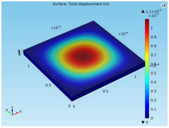 The finite element method (FEM) software COMSOL was used to simulate the bending of the pressure sensors under applied pressures. The model was simplified as follows: The sealing holes were removed, and only two metal layers (top and bottom) were used for the simulation. The initial residual stress of the oxide was set to −100 MPa for both x and z directions. In the simulation, the mass density of Al and SiO2 are 2.7 × 103 kg·m−3 and 2.2 × 103 kg·m−3, respectively. The Young’s modulus of Al and SiO2 is 72 and 70 GPa, respectively. The Poison’s ratio of Al and SiO2 is 0.35 and 0.17, respectively. Electromechanics module in the COMSOL was used to achieve both the structure deformation and capacitance information under applied pressure at z direction. As an example, the simulation result image of a 120 µm × 120 µm capacitive pressure sensor design at 120 kPa is presented in Figure 4.