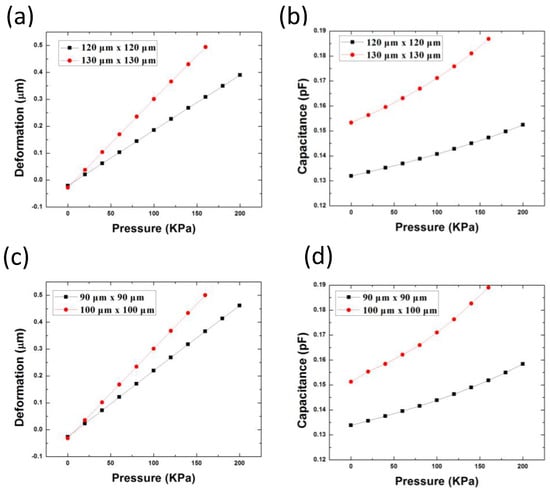 Simulation results for pressure sensor Design 1: (a) deformation; (b) capacitance, and Design 2; (c) deformation; and (d) capacitance with applied pressure.