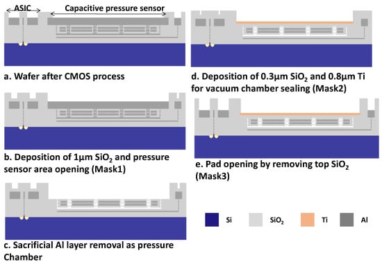 The MEMS pressure sensor structure was formed in the CMOS fabrication, including the bottom electrode (M2 for Design 1, M2/3 for Design 2), middle metal for cavity (M3 for Design 1, M4 for Design 2), top electrode (M4/5 for Design 1, M5 for Design 2), and via connection from the middle metal to M6. Figure 6a is the structure after CMOS fabrication by the commercial foundry. Subsequent three mask sets were used to achieve the vacuum-sealed pressure sensor in the MEMS post-process. Firstly, 1-µm-thick PECVD SiO2 was deposited on the surface to protect the pad opening of the ASIC circuits in the silicon wafer. Next, the pressure sensor area was opened and the previous SiO2 layer was etched by reactive ion etch process (RIE) (Figure 6b). Then, M6, via, and middle metal were etched away by Piranha solution (H2SO4:H2O2 as 1:1). The wafer was then rinsed in distilled water (DI) and dried in CO2 supercritical dryer (Figure 6c). The cavity was opened in this process. The wafer was then coated by 0.3-µm thick low stress PECVD SiO2 and 0.8-µm thick titanium for vacuum chamber sealing. Titanium acts as high-density material for sealing, and, also, it can absorb moderate remaining gas in the chamber to keep the chamber at high vacuum level (<0.01 Torr). The Ti was etched outside of pressure sensor region (Figure 6d). Finally, the pads were opened by removal of the SiO2 (Figure 6e).