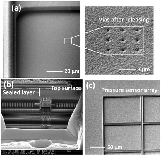 The key step in the post-process is the sacrificial metal layer release. The etching time and drying condition were finely tuned to ensure the middle metal layer, and vias are fully removed and the membrane is intact without collapse and obvious uneven surface. Figure 7a shows the scanning electron microscope (SEM) image at the completion of sacrificial layer and via removal. According to the 0.18-µm CMOS process, the via size is 0.26 µm × 0.26 µm. The 0.3-µm thick SiO2 and 0.8-µm thick Ti are sufficiently thick to deposit on the side-wall of via and seal the via5. After the sealing of via holes by SiO2 and Ti, the surface kept flat and holes were fully filled, as seen from Figure 7b,c. In Figure 7c, no sign of the via structure can be observed. In addition, from the cross-section view of the pressure sensor image in Figure 7b, the via was fully sealed with ~0.9 µm sealing layers on top.