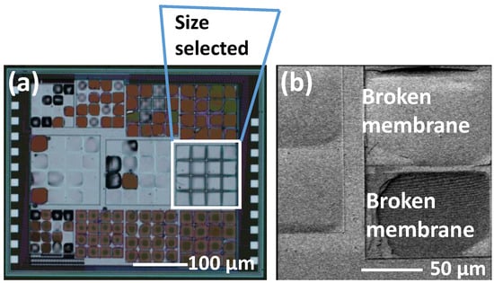 (a) Photo image of sensor array with different design and designs; (b) SEM image of damaged membrane.