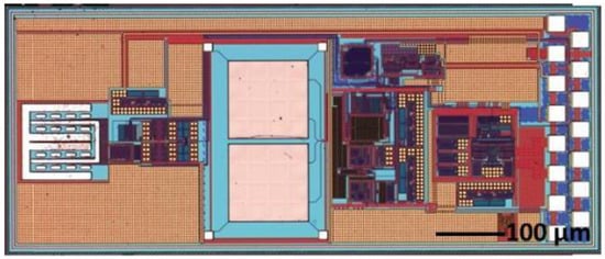 In each sensor chip, we had 2 sets of 4 × 4 pressure sensor array to increase the overall sensitivity. The 16 sensors in each array were connected in parallel in the design. Thus, the total capacitance increased 16 times, decreasing the pressure detection limitation of the circuit. The differential sensor configuration of the pressure sensor array will reduce the noise floor. Figure 9 is the image of the integrated MEMS-ASIC system consisting of temperature-oxygen-pressure sensors and their interface circuits. Each component corresponds to the layout block in Figure 2. The bonding pads on the right side of the die were made of aluminum. Titanium was covered on top of the two differential pressure sensor arrays.