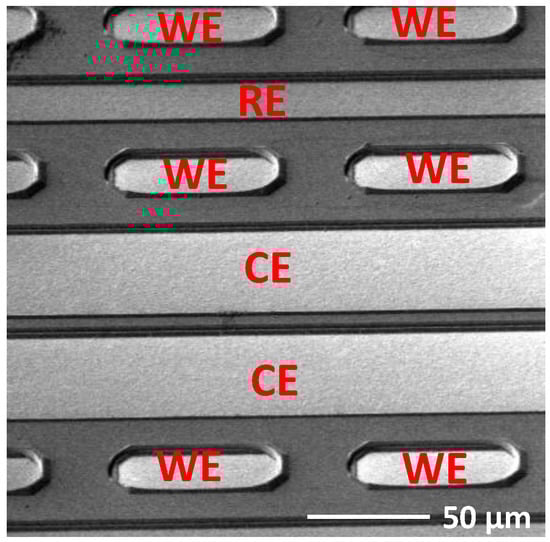 A further photo-mask was used to pattern 200-nm thick platinum on the oxygen sensor electrode region for the working electrode (WE), reference electrode (RE), and counter electrode (CE). The 16 WEs have dimension of 50 µm × 25 µm. One RE and one CE are located at side of the WE (shown in the left region of Figure 9). The SEM image in Figure 10 gives a close look at the oxygen sensor electrode configuration.