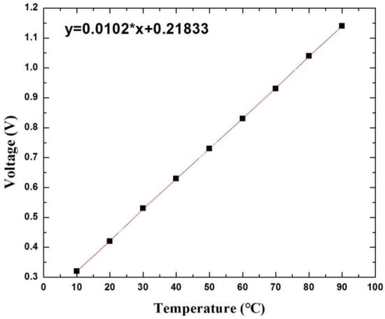 For the temperature sensor calibration, the sensor was placed into a temperature chamber, and voltage and clock signals were applied to the sensor chip (Figure 12). The output voltage was recorded by a multimeter. From the result presented in Figure 13, the voltage response to the temperature variation is linear, with a sensitivity of 10.2 mV/°C.
