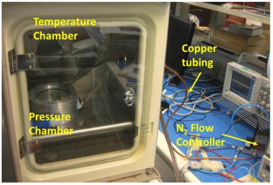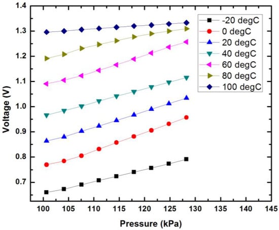 In the process of the pressure sensor calibration, the chip was placed into a small pressure chamber with gas and pressure regulator connection. The small pressure chamber was then placed into a temperature oven for constant temperature control. Electrical cables were used to connect the sensor with the power supply and the clock signal generator. A multimeter was used for the output voltage measurement (Figure 14). Figure 15 shows the calibration results of the pressure sensor under temperature from −20 °C to 100 °C. The pressure sensor has similar sensitivity from −20°C to 80 °C at an average of 5.58 mV/kPa with a maximum 12% variation. In the application of physiological pressure monitoring, the pressure values are obtained from the calibration results with temperature compensation assistance from the solid-state temperature sensor.