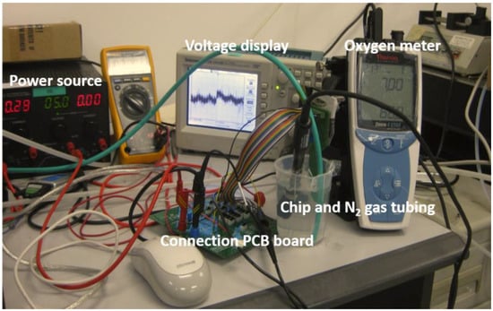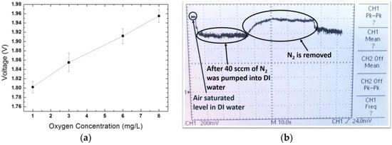 The oxygen sensor setup was shown in Figure 16. The sensors were dipped into the DI water together with the commercial O2 meter. A N2 gas was pumped into the DI water to tune the dissolved oxygen concentration in the water. Figure 17a is the measurement result of the sensor response at different dissolved oxygen concentration. Figure 17b is the transient response of the sensor before and after pumping the nitrogen gas. The voltage output has high linearity and is stable at fixed oxygen concentration level. The sensitivity of the sensor is 20 mV·L/mg. The transient time after being filled with 40 sccm N2 gas from air saturated condition is ~3 s. The transient time after removal of the N2 gas to air saturated condition is ~15 s. The 15 s also includes the equivalent time that allows the air to dissolve in the water.