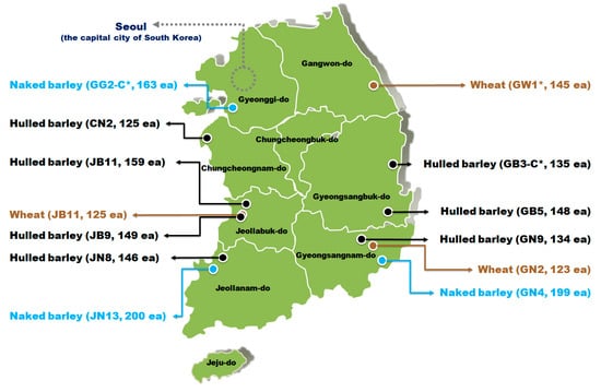 Geographic locations and numbers of hulled barley, naked barley, and wheat used in the experiments from each location. Sample groups marked with an asterisk (*) are control groups.