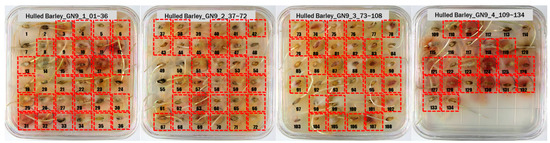 Figure 5 shows the state after culture of the GN9 samples, in which 106 grains generated Fusarium spores: the largest number among the hulled barley sample groups that were used as experimental groups. The samples that generated spores were marked by red dotted lines.