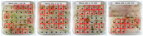 For the hulled barley samples, a total of 996 grains including the GB3-C samples, which were the control group, and the samples collected from six regions, which were used as the experimental group, were placed in the square dishes—36 grains per dish—and were cultured. After four days, the cultured samples were discriminated by experts with the naked eye for contamination with Fusarium. In the control group (GB3-C), no spore contaminated with Fusarium was observed in the preliminary and second culture experiments. In the case of JB11, which was used as an experimental group, one grain was found to be contaminated with Fusarium in the preliminary culture experiment, but in the main experiment, no contaminated hulled barley grain was found. In the other experimental groups, Fusarium spores were observed, although the quantities were different. Therefore, 135 GB3 grains were used as the control group samples for discriminating hulled barley grains contaminated with Fusarium. For the experimental groups samples, a total of 150 grains were used, including GB5 (1 grain), GN9 (106 grains), JB9 (26 grains), JN8 (15 grains), and CN2 (2 grains) for hulled barley samples contaminated with Fusarium. Figure 4 shows the status of the GB3 samples after culture, which were the hulled barley samples that were used as the control group. Normal hulled barley germinated with no generation of spores.
