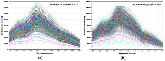Figure 12 shows the reflectance spectra of 1446 (NCF: 870, CF: 576) obtained from 241 wheat samples (NCF: 145, CF: 96). Figure 12a shows 870 raw reflectance spectra acquired from 145 grains of wheat samples that were not contaminated with Fusarium. The maximum rising peak occurred at 1579 nm wavelength, where those of hulled barley and naked barley grains occurred. The second rising peak occurred at 1314 nm. Figure 12b shows 576 raw reflectance spectra acquired from 96 grains of wheat samples contaminated with Fusarium. The first and second rising peaks occurred at wavelengths similar to those of normal wheat.