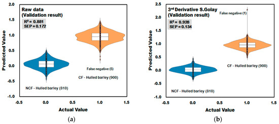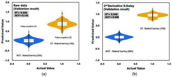 Figure 14a shows the result of the PLS-DA model developed using the raw spectra acquired from naked barley samples. In the raw data in Figure 14a, one of the 894 spectra acquired from NCF-naked barley samples was predicted as higher than 0.5, which is the reference value, resulting in a CCR of 99.89% (893/894). In the CF-naked barley samples, three of the 198 spectra was predicted as lower than 0.5, which is the reference value, resulting in a CCR of 98.48% (195/198). Figure 14b shows the PLS-DA model developed by applying third-order derivative pretreatment to the raw spectra acquired from naked barley samples. Validation performance of NCF-naked barley and CF-naked barley showed 100% CCR. The validation model improved to RV2 = 0.948 and decreased to SEP = ±0.088.