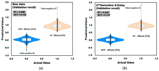 Figure 15a shows the result of validation model of PLS-DA developed using raw spectra acquired from wheat. In the developed validation model, one of the 576 spectra acquired from CF-wheat samples was predicted as higher than 1.5, which is the reference value, resulting in a CCR of 99.83% (575/576), and one of the 870 spectra acquired from the NCF wheat samples was predicted as lower than −0.5, which is the reference value, resulting in a CCR of 99.66% (867/870). Figure 15b shows the validation result of the PLS-DA model developed by applying second derivative pretreatment to raw spectra acquired from wheat samples. One of the 576 spectra acquired from the wheat samples contaminated with Fusarium was predicted as higher than 1.5, which is the reference value, resulting in a CCR of 99.83% (575/576). The RV2 of the validation model applying the second-order derivative pretreatment was 0.933, which is higher than the result of the raw spectra, and the SEP decreased to 0.127, proving the effect of the spectra pretreatment.