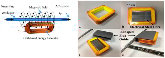 The coil-based harvester is a credit-card sized (8.9 × 6.7 × 1.6 cm) rectangular coil having typically 1250 turns of insulated copper wire wound on a polymeric form (Figure 1a) and provided with a core of “electrical steel”—sheets of high-permeability steel widely used in electric power transformers (Figure 1b). The coil couples to the magnetic field generated by the AC current flowing in one conductor of a conventional overhead line [5].
