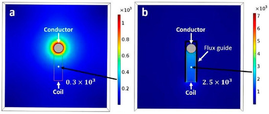 COMSOL simulation of the magnetic field intensity around the conductor without the flux-guide (a) and with the flux guide (b). The magnetic field intensity with the flux guide increases 8.33 times compared to no flux guide at the point illustrated by the light color dot (Note that the scales of the left and right figures are different).