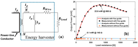 Figure 3b shows the measured output power with and without using the flux guide as a function of the load resistance when the conductor current is 10 Arms. For the harvester without using the flux guide, the maximum output power of 0.1 mW is measured with the load resistor of 140 Ω. When the flux guide is used, the maximum output power of 22.8 mW is achieved when the load resistor is 800 Ω. By using the flux guide, the output power of the harvester increases more than 228 times compared to the output with no flux guide.