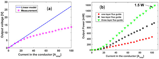 (a) Output voltage vs. current in the power-line conductor, = 400 Ω; (b) Measured output power vs. current in the power-line conductor, = 400 Ω, 600 Ω and 1 kΩ for one-layer, two-layer and three-layer flux guides, respectively.